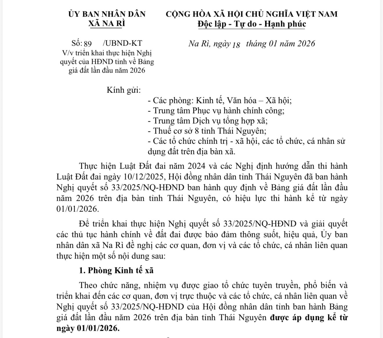 Để triển khai thực hiện Nghị quyết số 33/2025/NQ-HĐND và giải quyết các thủ tục hành chính về đất đai được bảo đảm thông suốt, hiệu quả, ngày 18/01/2026, UBND xã Na Rì ban hành công văn về việc triển khai thực hiện Nghị quyết của HĐND tỉnh về Bảng giá đất lần đầu năm 2026. (Xem Nghị quyết số 33/NQ-HĐND ở file đính kèm)