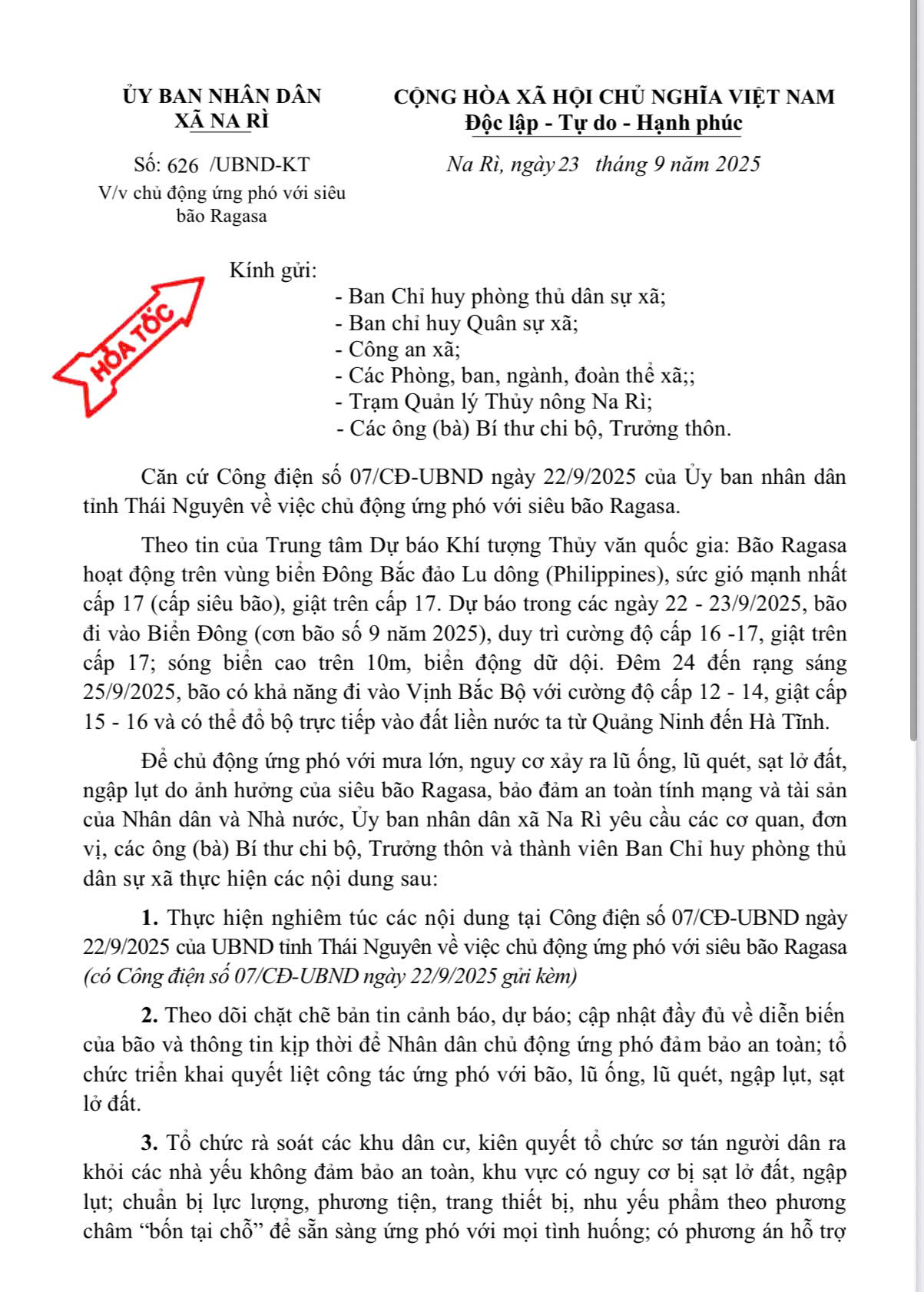 Ngày 23/9/2025, UBND xã Na Rì ban hành Văn bản số 626/UBND-KT về việc chủ động ứng phó với siêu bão Ragasa. Xem chi tiết tại văn bản.
